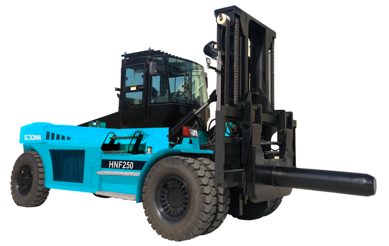 Дизельный вилочный 25-тонный погрузчик SOCMA HNF250T оснащён поворотным шинным манипулятором, грузоподъёмностью 9 000 кг, предназначенным для снятия и последующей установки колёс карьерных самосвалов до 63-го радиуса включительно. Грузоподъёмность составляет 25 000 кг при ц.т. 1250 мм. Данная модель оснащена двигателем Cummins QSL9.3-C220 – объёмом 9,3 л, мощностью 220 л.с., электронной трансмиссией SOCMA, полной кабиной с кондиционером, зуммером заднего хода, джойстиком управления и т.д. Погрузчик специально разработан для рынка добывающей индустрии Российской Федерации.